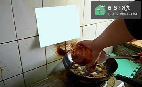 7葱段略炸,下入郫县豆瓣酱,开中火,不停的翻滚搅拌,铲子一定要接触到锅底,炒的郫县豆瓣酱与先前放的三种油融入到一起,而且在上面漂浮一次红油,就可以了。