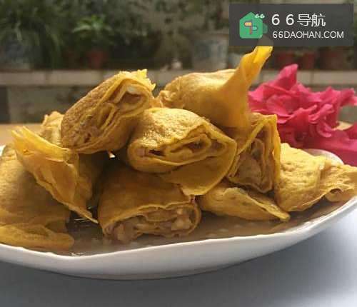 取适量的肉馅均匀地放在蛋皮上,然后卷起来。