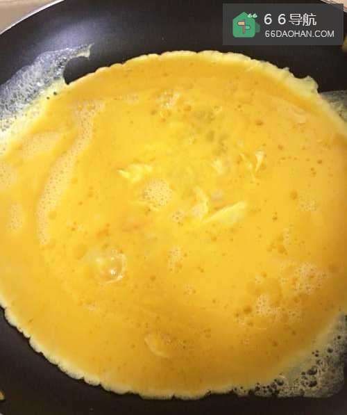 4充分搅拌后倒入打好的蛋液,注意火不能太大,要不鸡蛋比较容易糊;
