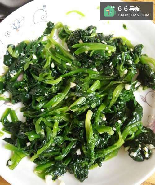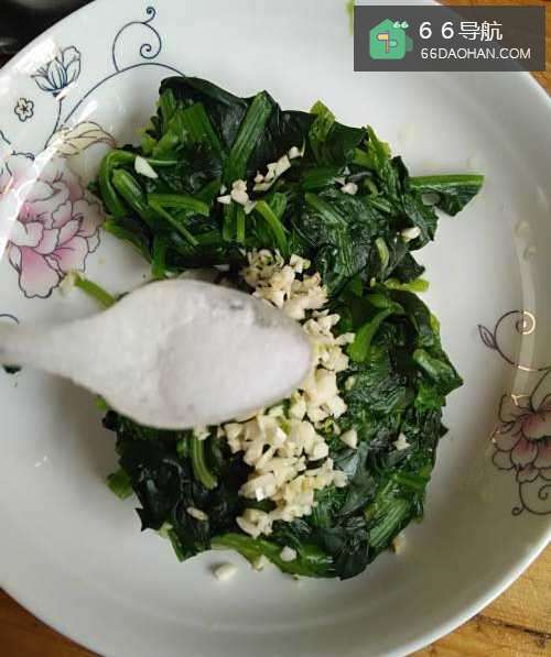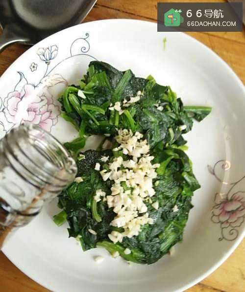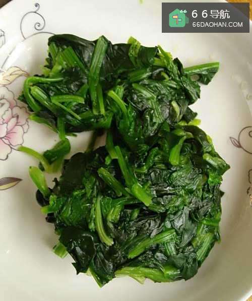 5等菠菜焯成深绿色,焯熟,捞出来,挤干水分,放入盘中。