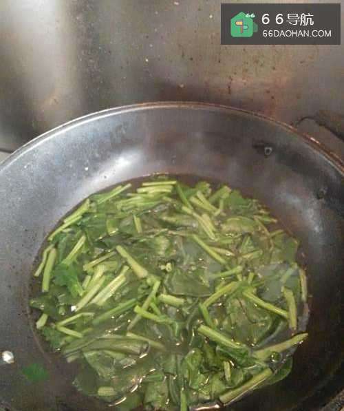 4将菠菜放入沸水中,焯一下,可以先放入菜杆,再放入菜叶。