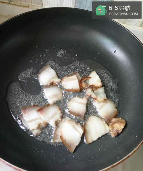 4锅里放少量油,腊肉炒出油,加入配菜和白糖。