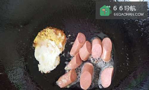 10盛入盘中,放入煎好的肠和鸡蛋。