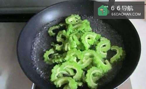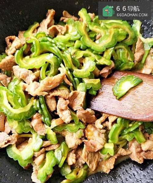 5将鸡肉放入锅中翻炒至熟后,倒入苦瓜快速翻炒,加入适量盐就可以出锅了。