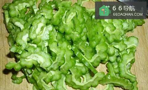 新鲜的一根苦瓜洗干净、去瓜瓤,然后用刀切成厚薄均匀的苦瓜片。