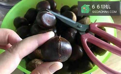 3把板栗用剪刀,直着剪个口子,和板栗长度一样长,这样烘烤的时候,板栗张开的快,方便蜂蜜入味。