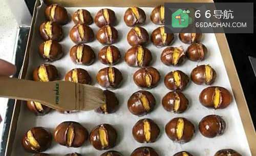 8烘烤15分钟时,板栗已经张开口了,戴着手套把板栗端出来,在板栗开口处,刷上一层蜂蜜水,挨个刷好,再次放入烤箱中层,烘烤10分钟,出炉。