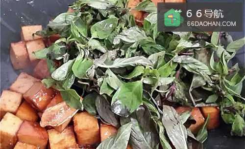 4三杯酱汁倒入锅中内翻煮收汁,收汁之前放入九层塔、辣椒,即可起锅