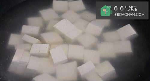 2坐热一锅水,加半勺盐,豆腐块放入水中 ,等水煮开后再捞出沥水备用。