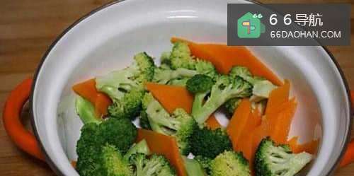 3用焯豆腐的水,接着把切菱形片的胡萝卜和洗净的西蓝花也焯1分钟左右,接着用凉水拔一下。