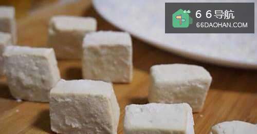 4在一个盘子上放上玉米淀粉,将豆腐均匀裹上一层干粉。