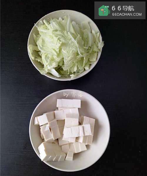 备好食材嫩豆腐洗净,切小方块;白菜洗净,撕碎;再备点姜片老姜洗净,切片;