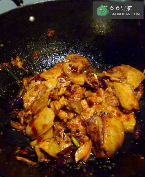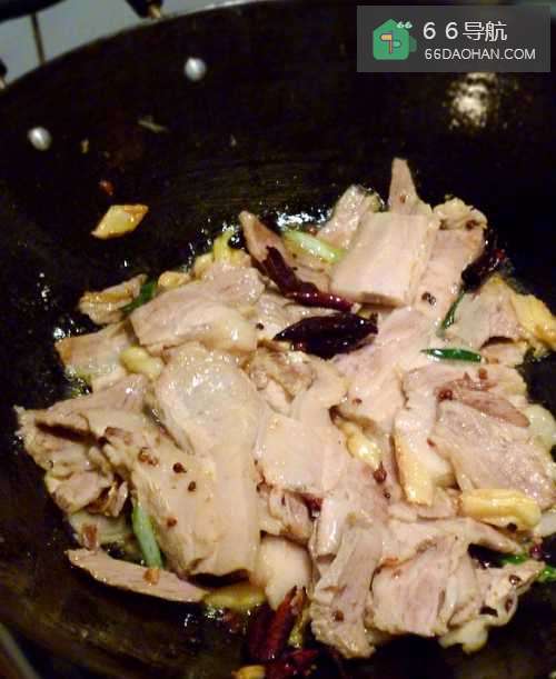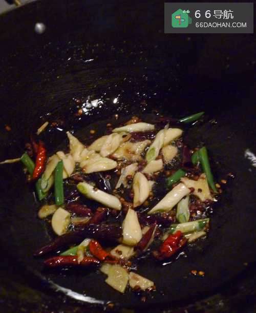 5炒锅上火,加很少的油煸香辣椒、花椒及葱姜蒜。