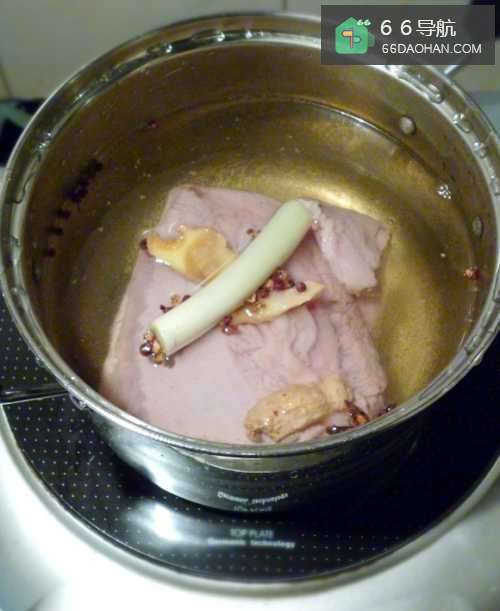 1.皮五花肉冷水下锅加入葱段、姜片花椒7、8粒,黄酒适量煮开