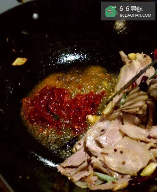 7将肉拨到锅一边,下入郫县豆瓣酱(可以先剁细)炒出红油。