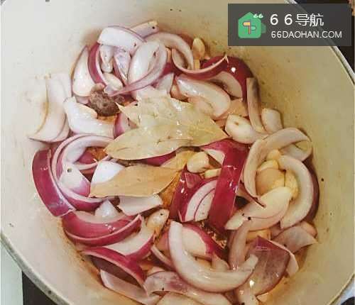 2在原锅下洋葱和蒜粒炒约2分钟,加入月桂叶和红椒粉。
