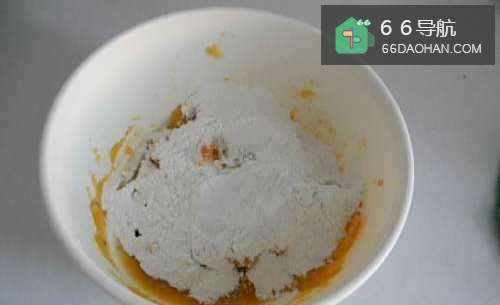 4过筛后的地瓜泥倒入糯米粉,糯米粉的量依照地瓜的水分含量添加,我的地瓜比较干,400g的地瓜我放了约100g的糯米粉。