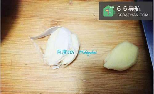 4准备少许辅料生姜、蒜头,将生姜洗净去皮切丝,蒜头拍碎切末。
