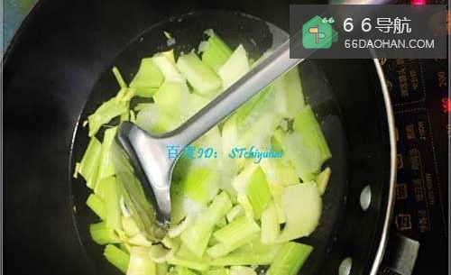 2准备一把新鲜的西芹,将西芹洗净,然后去除老的部分,将余下的切成小段状,打开电磁炉,往锅内加入适量的水,先将西芹放入水中焯一阵,去除一些食物碱,将焯过的西芹捞出沥干。