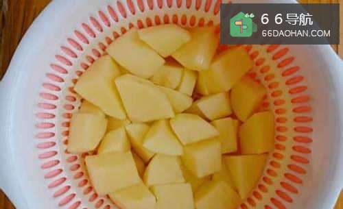 2土豆去皮切滚刀块,在流水下反复冲洗掉淀粉后,浸泡在水中,以防氧化变黑。