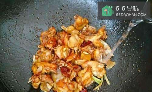 5把焯好的鸡肉倒下去,翻炒至每块肉上都均匀沾有糖色,然后放入葱姜蒜,干辣椒以及香料,炒出香味来。