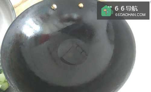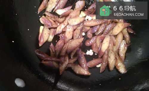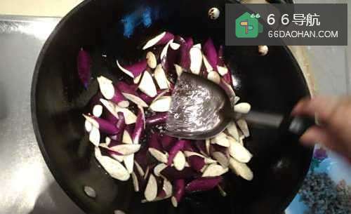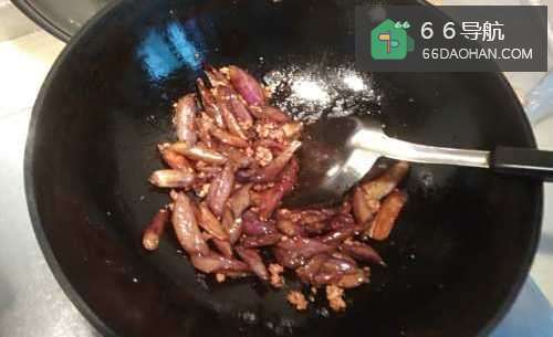 5茄子炒至干瘪,铲子按茄子柔软后,如图