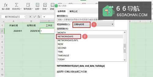 4在“插入函数”窗口,选择类别【日期与时间】—【NETWORKDAYS函数】,点击【确定】;