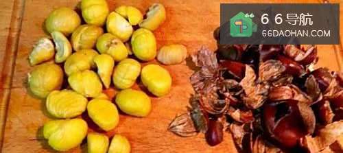5五分钟后夹出一个剥一个,趁热剥皮,不要一起都捞出来,烫过的板栗非常好剥皮了。