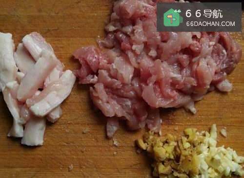 买来的猪肉洗干净后,肥瘦分离切成薄片备用;姜、蒜、青尖椒也切好备用。