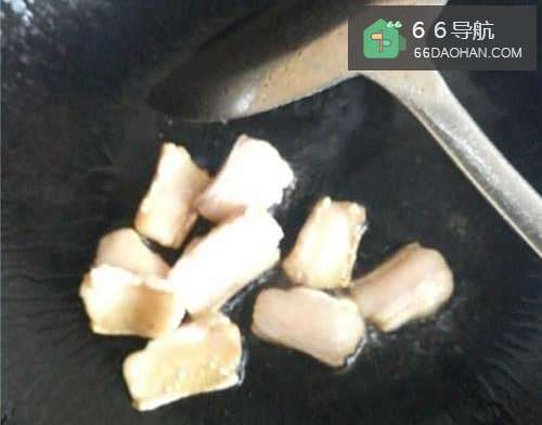 先将炒锅烧热,再放入切好的肥肉片,用中小火将里面的猪油煎出来。