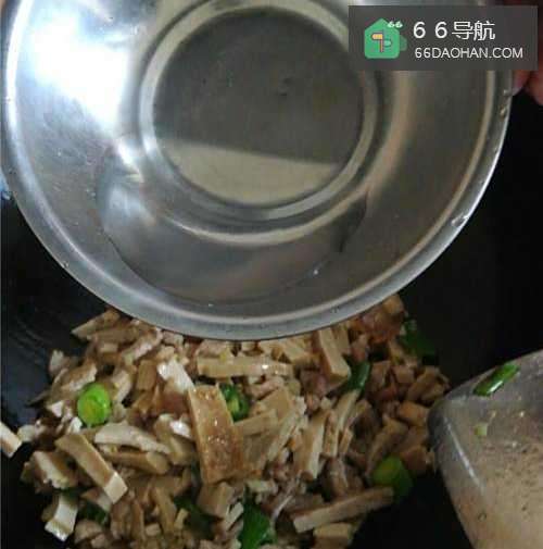 待干豆腐炒热后,放点蒜苗,再沿着锅边倒入少量水,盖上锅盖焖1分钟,就可以关火出锅啦!
