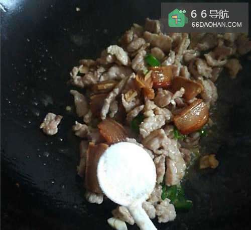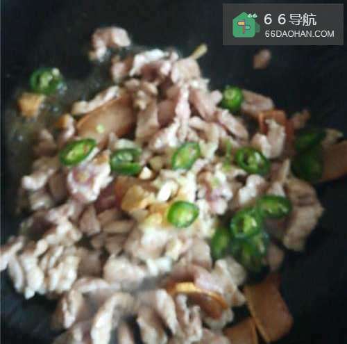 再倒入瘦肉,火力稍调大些,但不要用武火,翻炒瘦肉变色后,加入青尖椒去腥味。