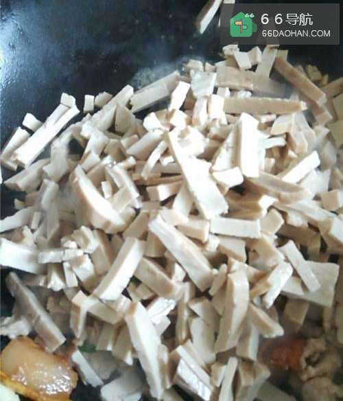 接下来就是放入见火就熟的豆腐丝啦!这时火力可以加大些,翻炒使干豆腐受热受油。