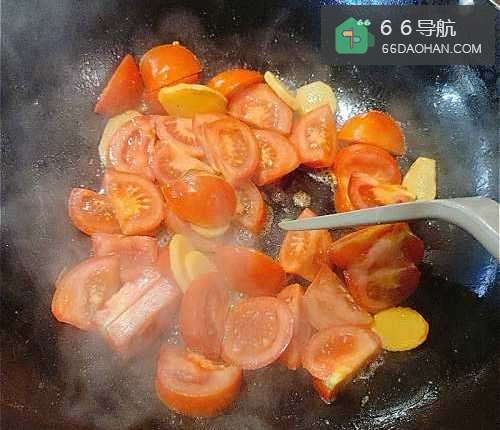2原锅大火加入番茄炒至软身出汁,再加入热水煮滚。