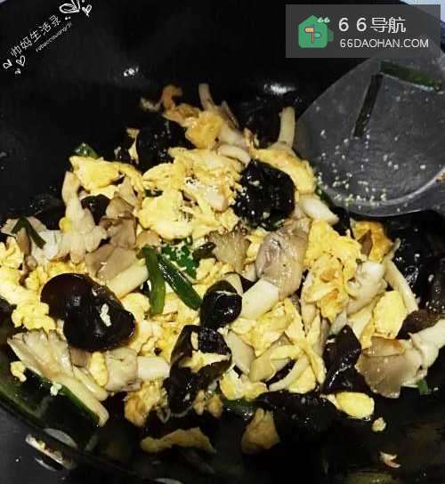 4葱段出香味时,依次加入黑木耳、平菇,翻炒一会,黑木耳入锅之后,就要不断地翻炒,不然黑木耳容易爆,木耳容易熟,翻炒几分钟后,加入少许盐和白胡椒粉。