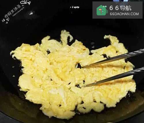 2锅里多放油,油温升高后倒入海鸭蛋液,用筷子划散,全熟后先盛出来。