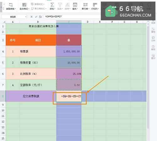 5选择单元格【C8】,输入计算公式【=C4*C6+C5*C7*2】,点击【Enter】完成计算。