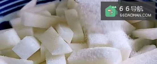 2处理洗净的白萝卜去皮,切成厚片后再切成粗条,切好后放进盆内加适量盐,比平时的量多一些就可以,再加一勺白糖,用手抓拌均匀腌制60分钟。