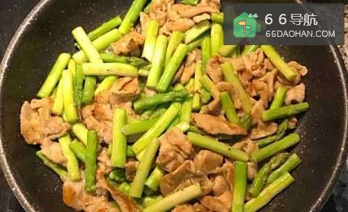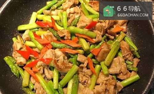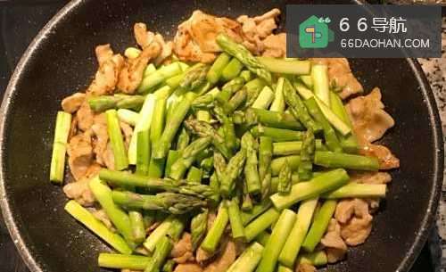 5肉片都上色后放入芦笋茎部快炒,再加入芦笋尾快炒