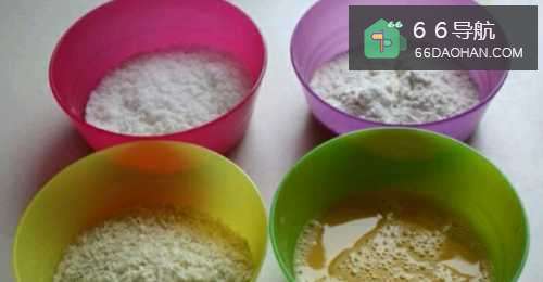 3我们做椰蓉虾分别取挂浆用的一般面粉,还有鸡蛋,面包,糖和椰蓉,将椰蓉和面包糖混合在一起搅拌均匀了,,
