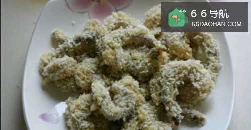 4最后我们再将按照先裹粉的做法,再礁鸡蛋的液,最后椰蓉和面包糖的顺序就会上浆了,
