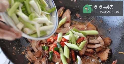 7等腊肉炒软后,倒入蒜苗茎翻炒。