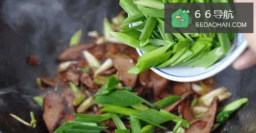 8等蒜苗茎炒软后倒入蒜苗叶关火,炒匀即可出锅。