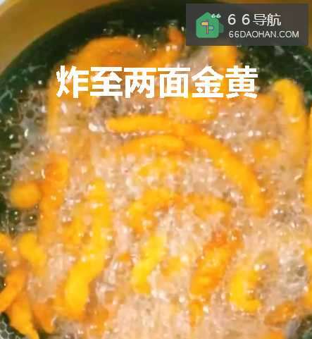 6●第六步大火热油,并将鸡柳入锅炸至金黄起锅。