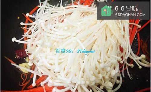6待胡萝卜丝变软之后,加入金针菇,混合炒一会,加入各种调味品,炒匀之后就可以装盘了,一道酸辣味的胡萝卜丝炒金针菇就做好了。