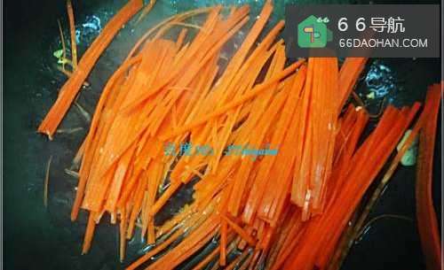 5控制油温,大约在150℃左右,先放入胡萝卜丝炒一阵,将胡萝卜丝炒软。