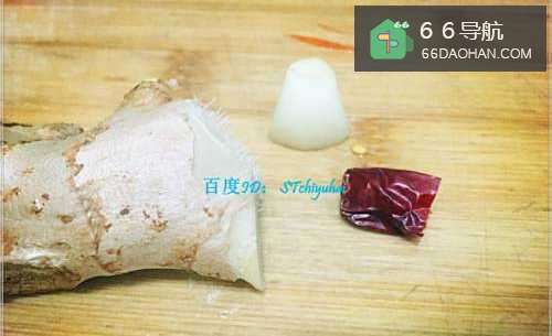 4准备少许生姜、蒜头、辣椒干,分别处理成姜丝、蒜末、辣椒段。