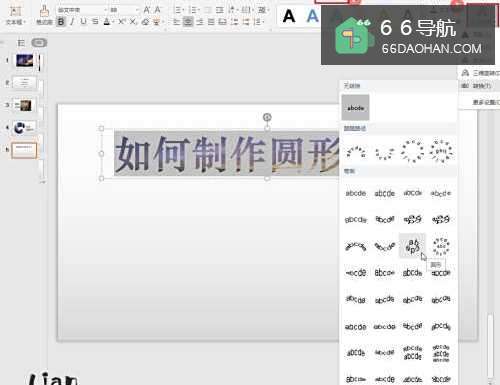 4点击【文本工具】——【文本效果】——【转换】,选择【弯曲】——【圆形联霜】即可;