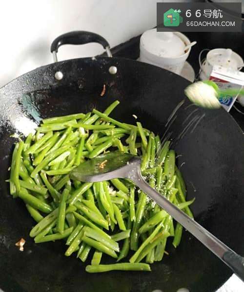 6第六步,倒入切好的青豆角在锅中翻炒。