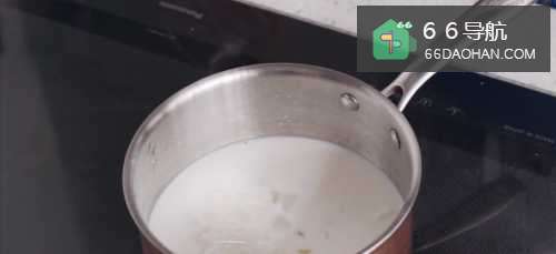 4往杏仁奶中加入牛奶,琼脂,再加冰糖,小火加热。